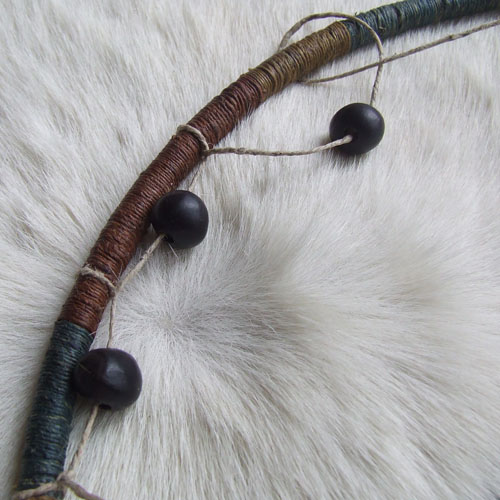 The use of beads helps add a personal touch to dreamcatchers and needs to be decided prior to threading. The above image shows how the initial pass of the thread around the ring is attached after being tied at your starting point. As you can see, I have added beads into the initial pass, although usually I tend to add beads at a slightly later stage of threading. This method of attaching the twine (in this case 4 ply giant Himalayan nettle) is all that is required to complete the web. The second and subsequent passes no longer wrap around the cane, but around the twine of the previous pass.